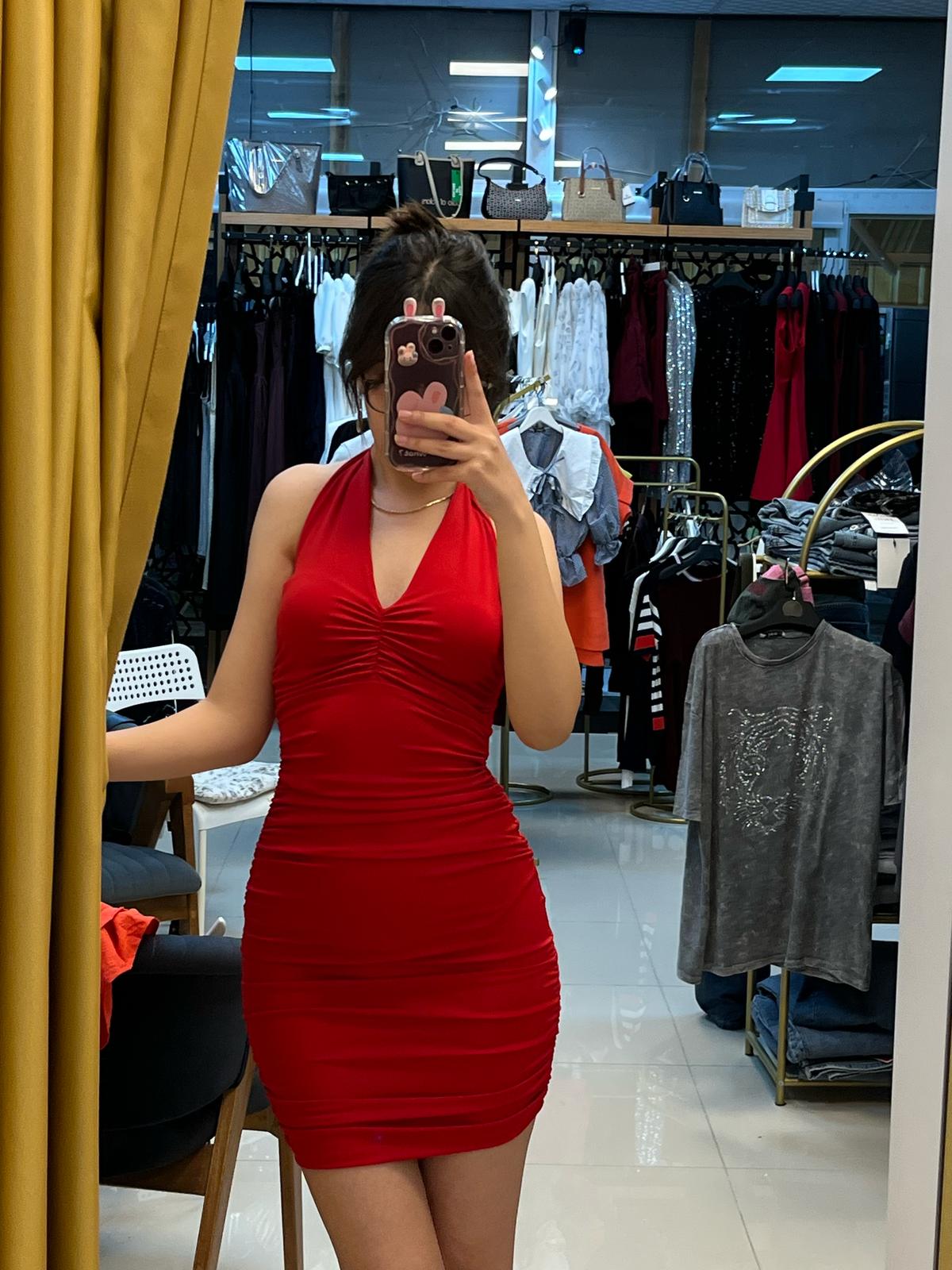 kırmızı boyundan bağlamalı elbise
