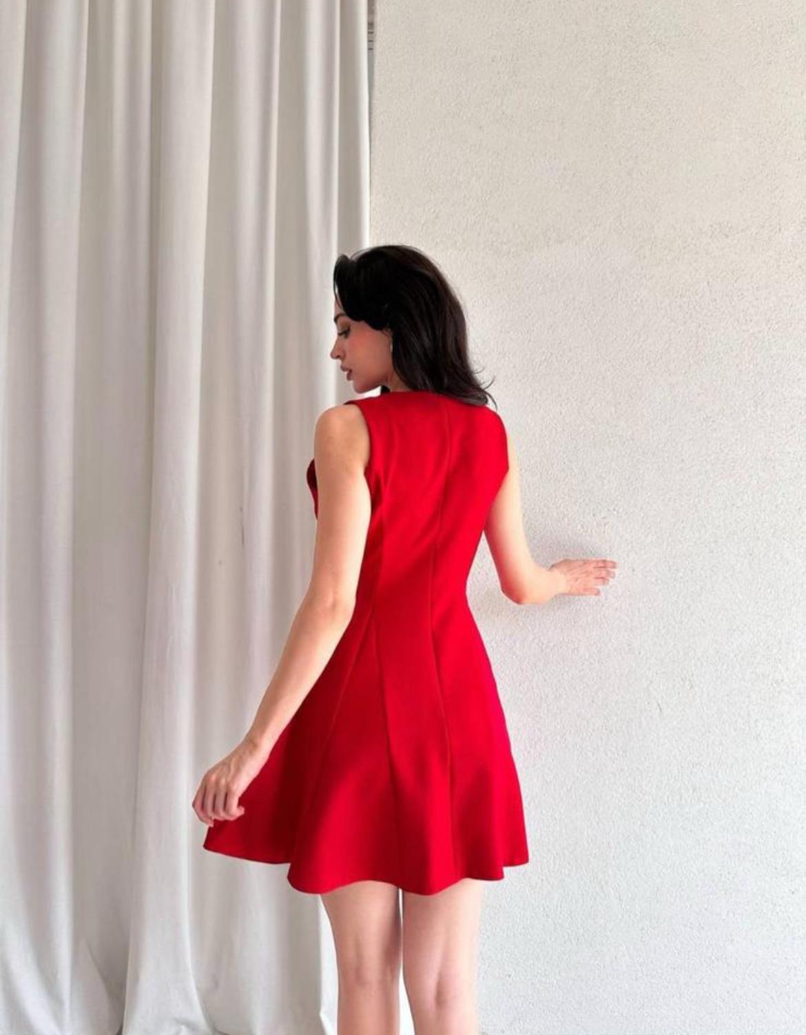 Kırmızı Gold Düğme Detaylı Elbise