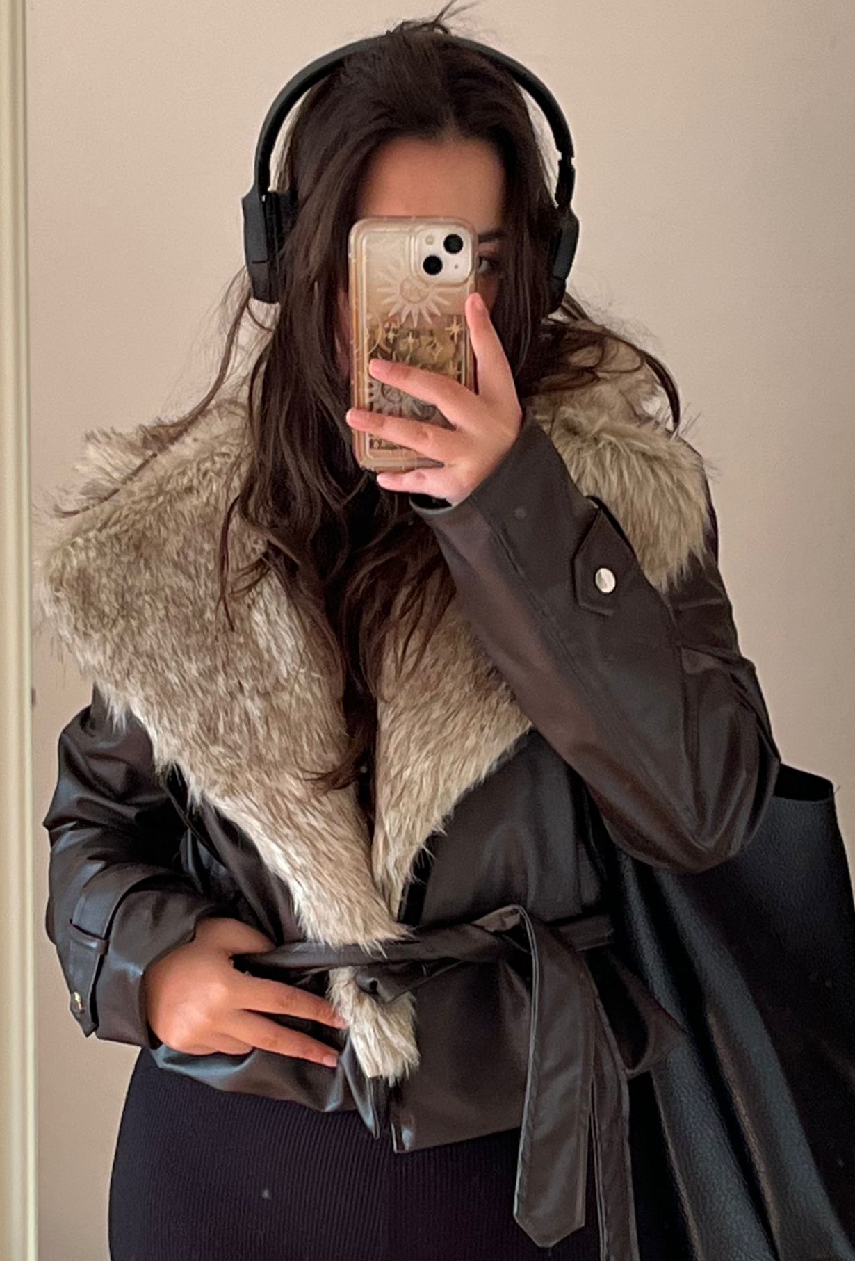Yakası Kürk detaylı Suni deri ceket